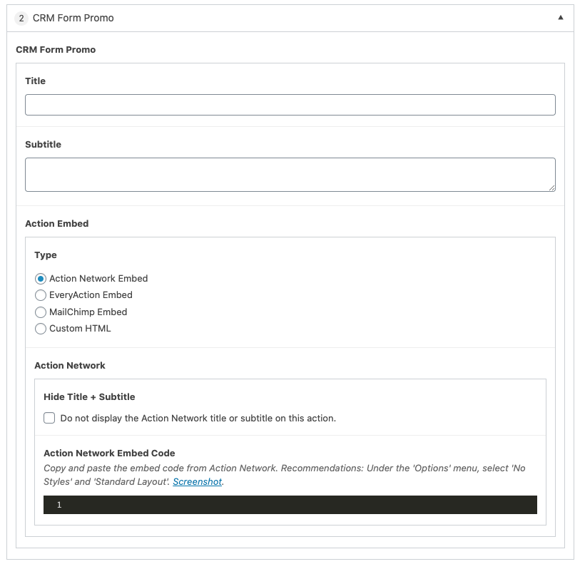In the Action Embed settings, we have various options that vary depending on the CRM that you intend to use.