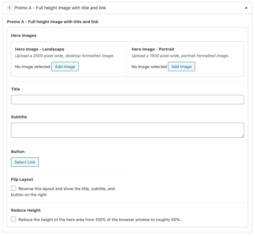 Hero Image – Portrait – Provide an optional portrait orientation image that will be used on narrower screen sizes. If this option is not set, the landscape version will be used as the default.