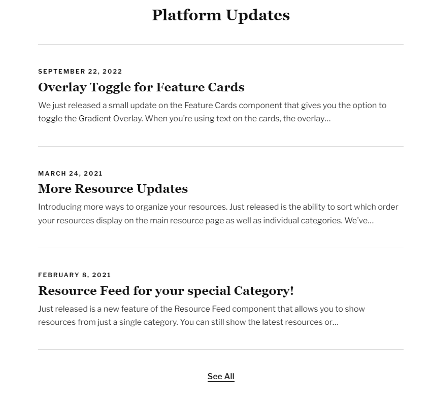 The Recent News Feed component provides a feed of content from the news section in chronological order (most recent first). This component can display in a feed-style or, a card-style.
